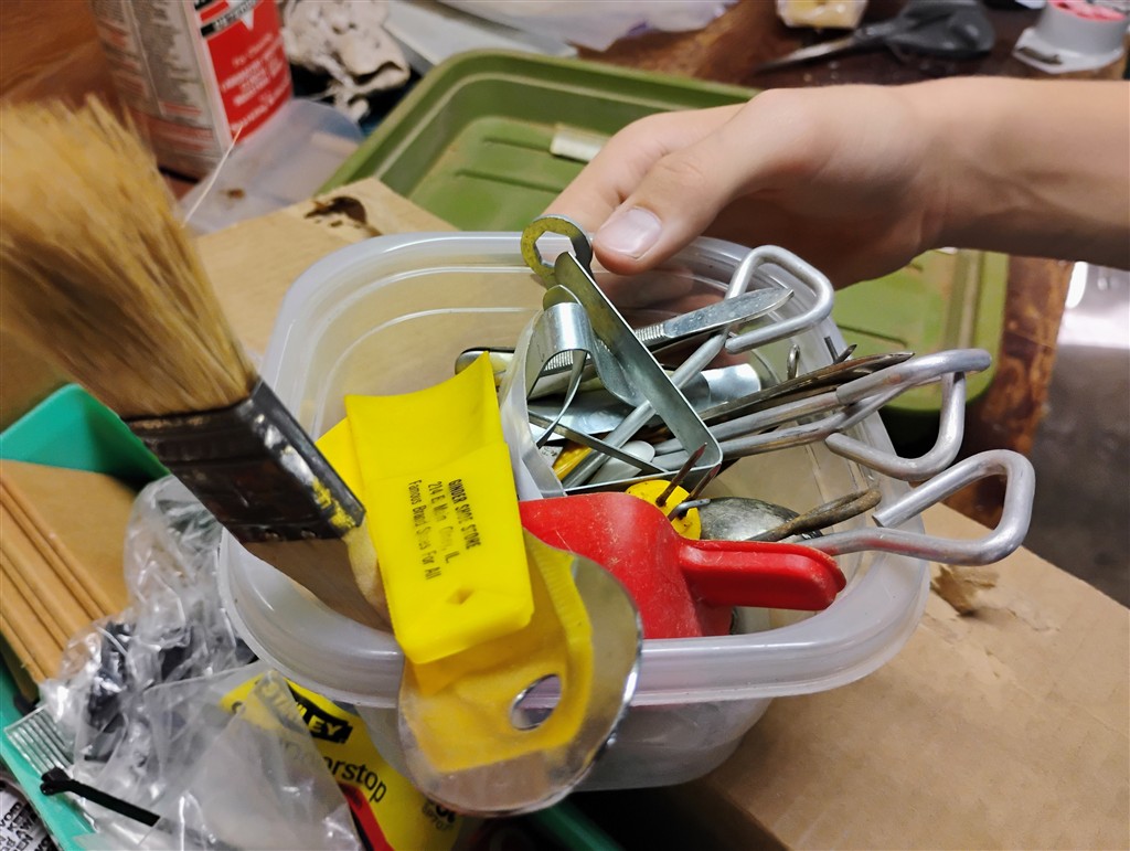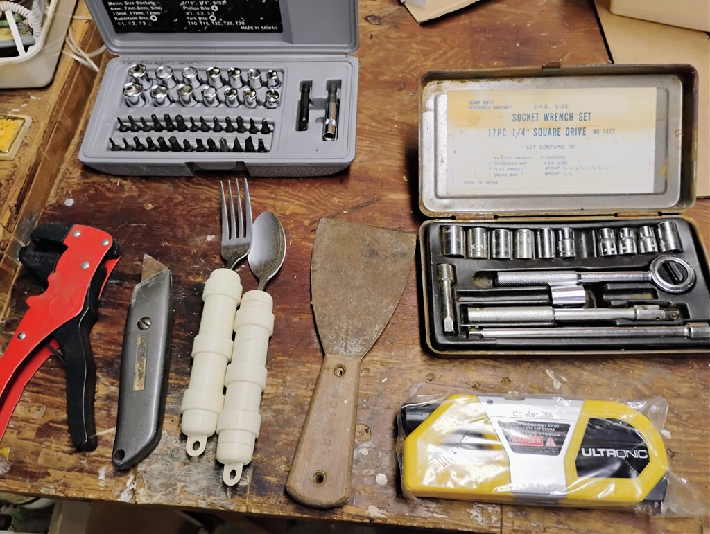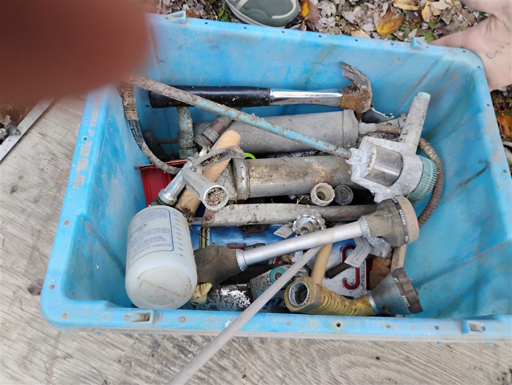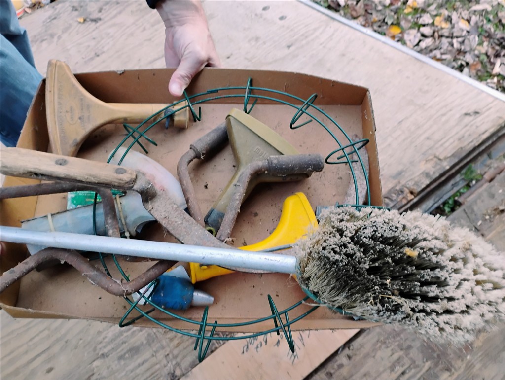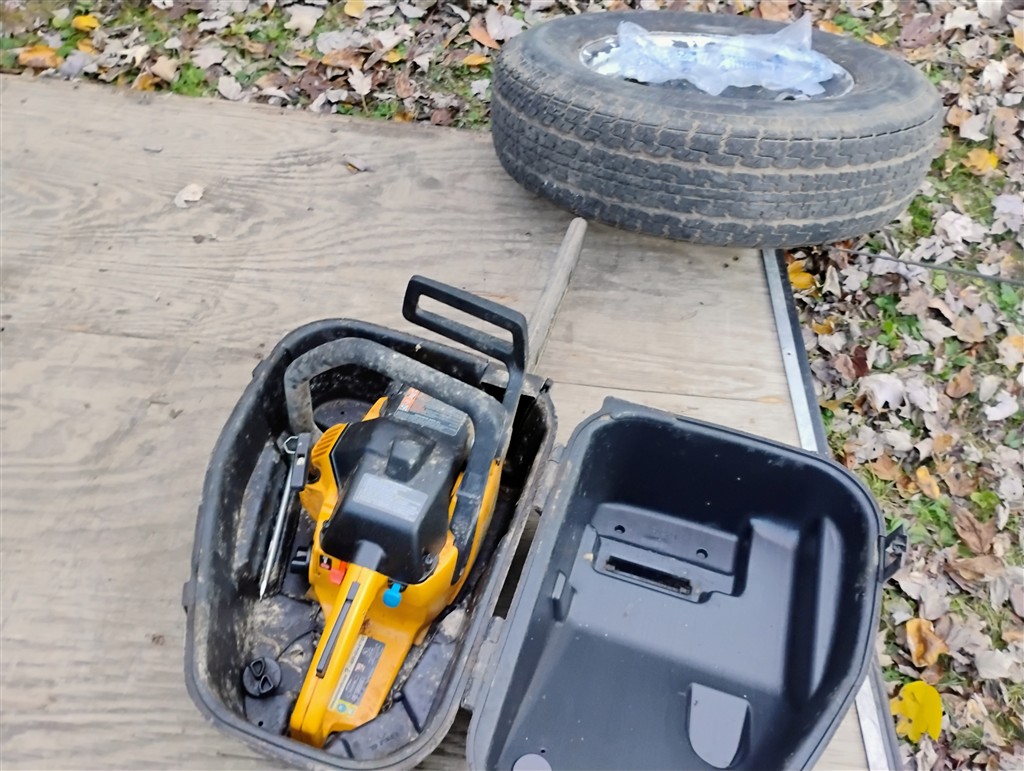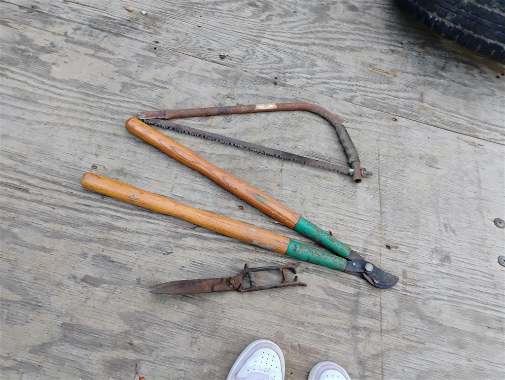 Chain Saw; Log Chain; Electrical Wire; Shop Vac; Air Pig; Cross Wrenches; Come A Long; Squares; Crowbar; Aluminum Ladder; Poly Wheelbarrow; Office Supplies; 4 Drawer Filing Cabinet; Hand Tools; Ratchets; Socket Sets; Painting Supplies; Geriatric Supplies; Organizers; C Clamps; Hand Saws; Corded Power Tools; Flexible Rulers