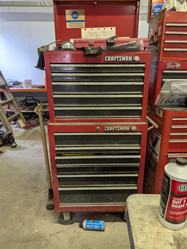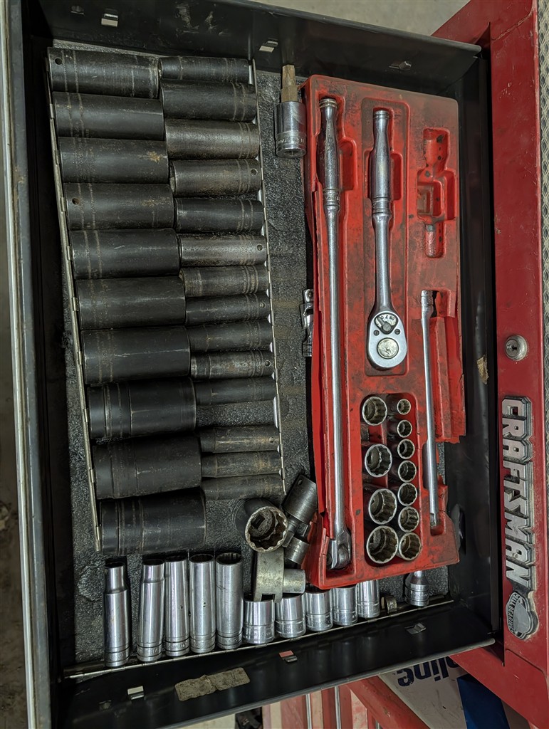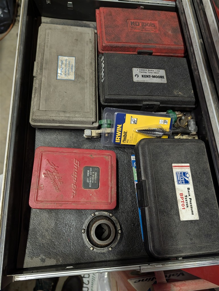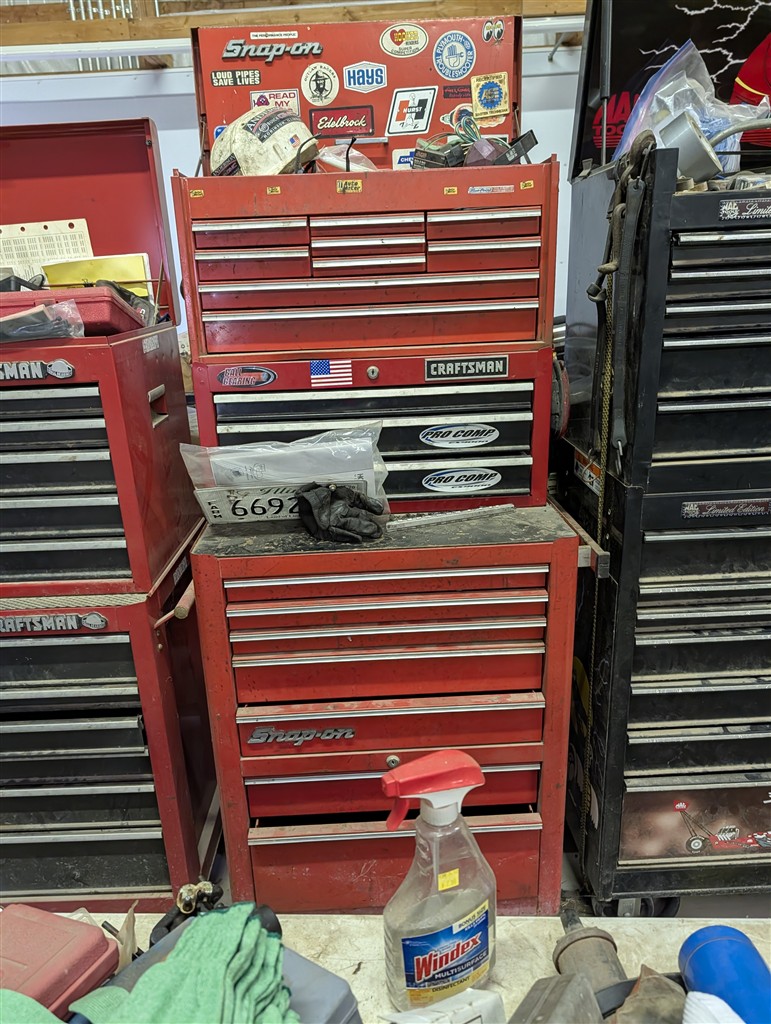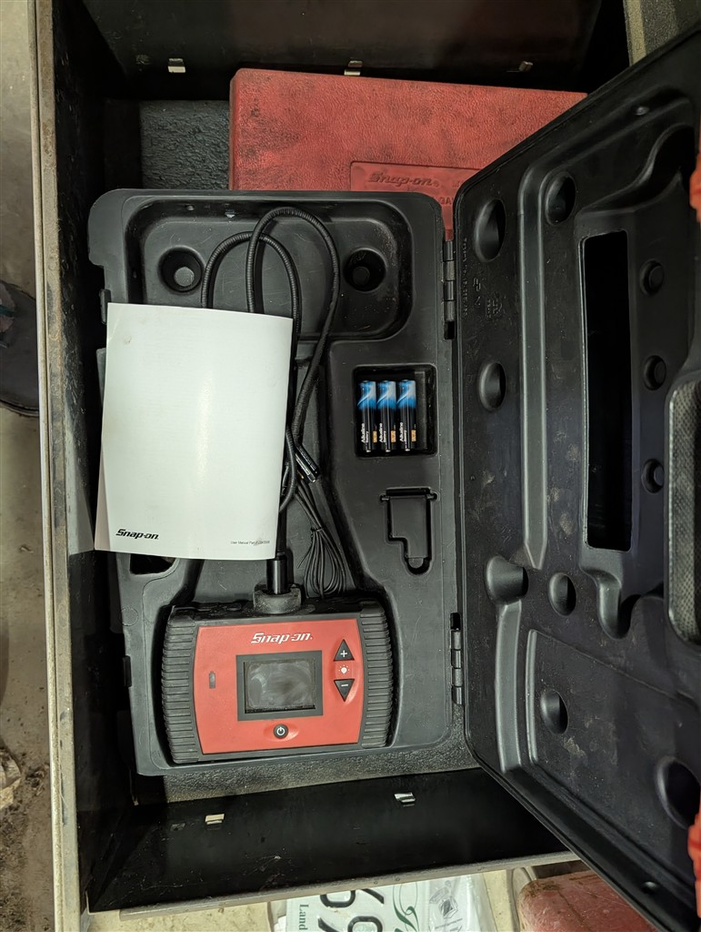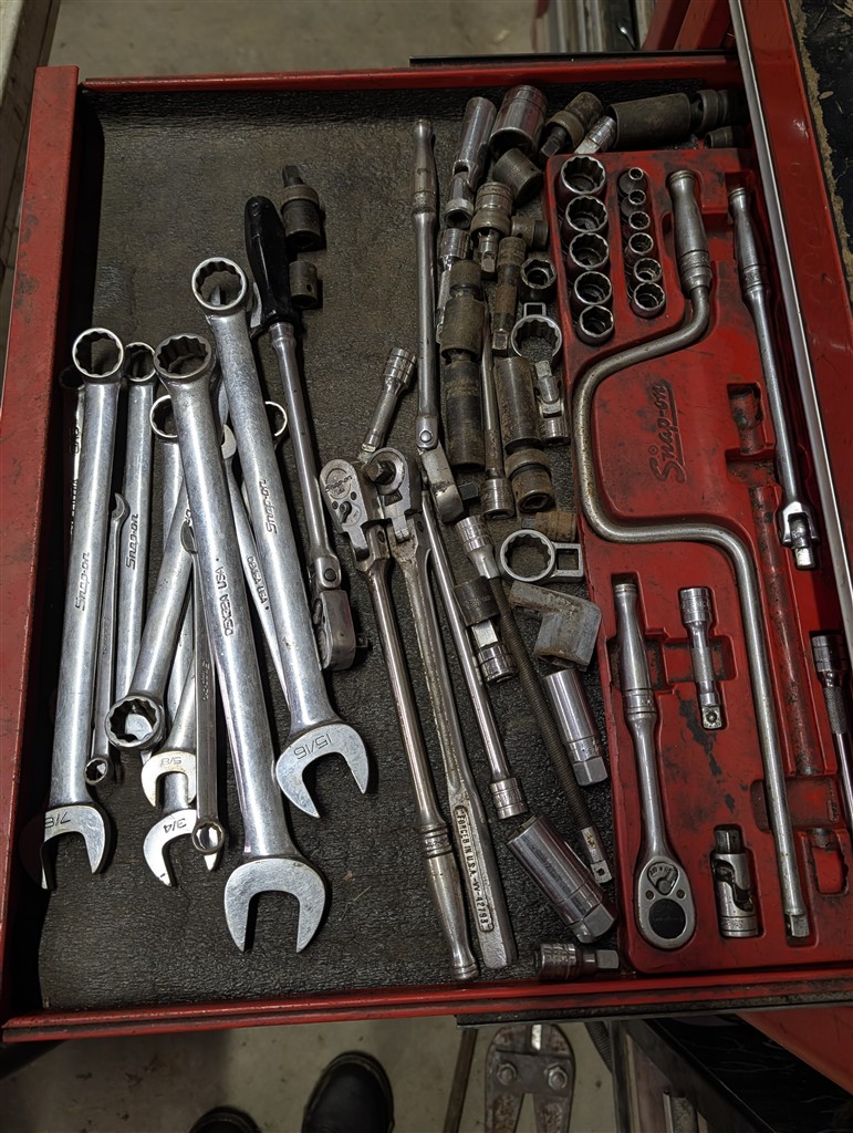 Snap-On 7-Drawer Rolling Cart; Snap-On Road Box; Snap-On 3-Drawer Tool Caddy; Snap-On Pry Bar; Snap-On 3/8” Drive Flex Head Bent Shaft Ratchet; Pry Bars; Snap-On 1/4″ Drive Ratchet/Socket Set In Cases; Snap-On Weather Head Fitting Socket Set; Snap-On 3/8” Drive Ratchet; Snap-On Shallow Sockets 3/8”; Snap-On 3/8” SAE Set; Snap-On 1/2″ Drive Metric Sockets; Snap-On 1/2″ Drive Deep Well Sockets; Craftsman Ratcheting SAE & Metric Wrench Set; Snap-On 1/2″ Drive SAE Sockets; Snap-On 1/2” Drive Ratchet; Snap-On 1/2” Extensions; Snap-On 1/2” Flex Head Socket; Snap-On Deep Well 1/2” Drive Sockets; (2) Snap-On Heavy Torque Wrenches; Snap-On Visual Inspection Camera; Snap-On Digital Start/Charging Tester; Snap-On Analog Start/Charge Tester; Snap-On Counselor II; Snap-On Puller Set; Snap-On Ring Plier Set; Snap-On Creeper; Snap-On 1/2” Drive Metric Sockets; Snap-On 1/2” Drive Deep Well Socket; Snap-On Deep Well 3/4” Drive Sockets; Snap-On Digital Torque Wrench