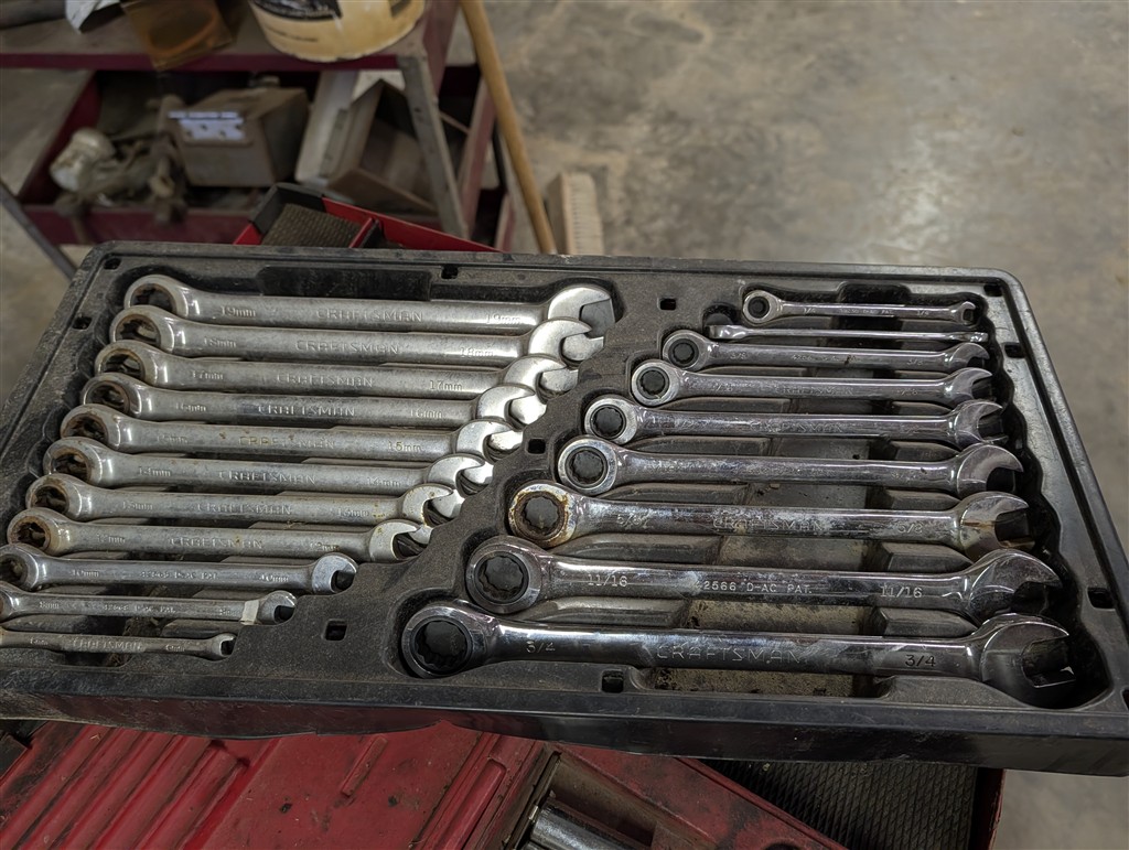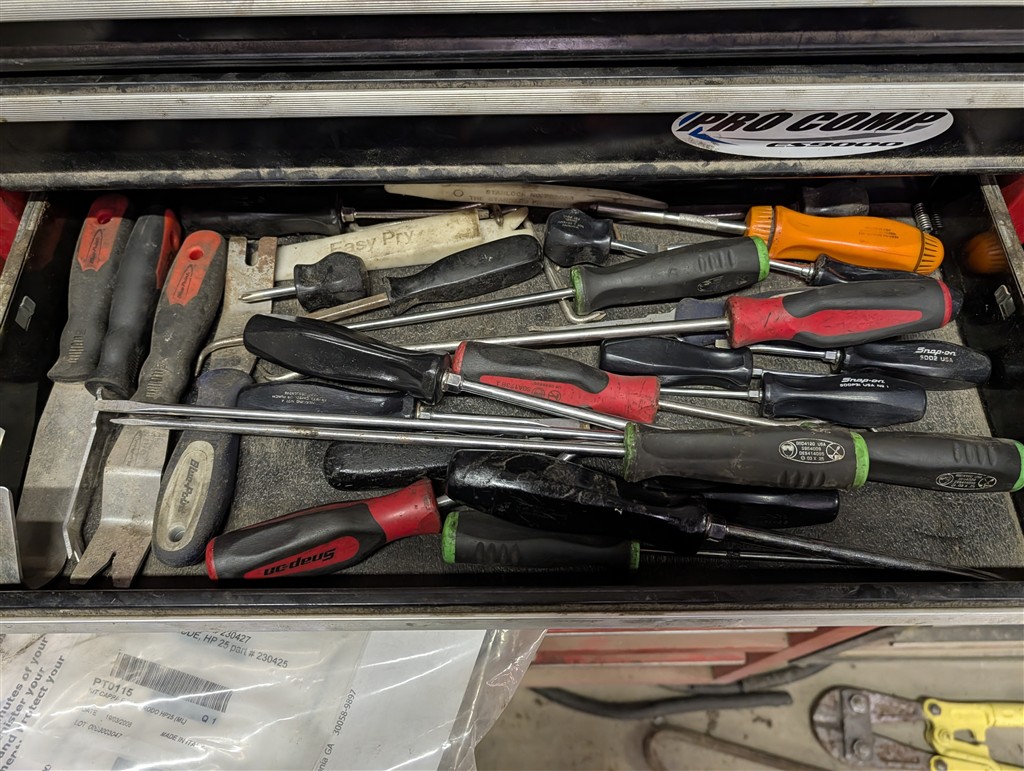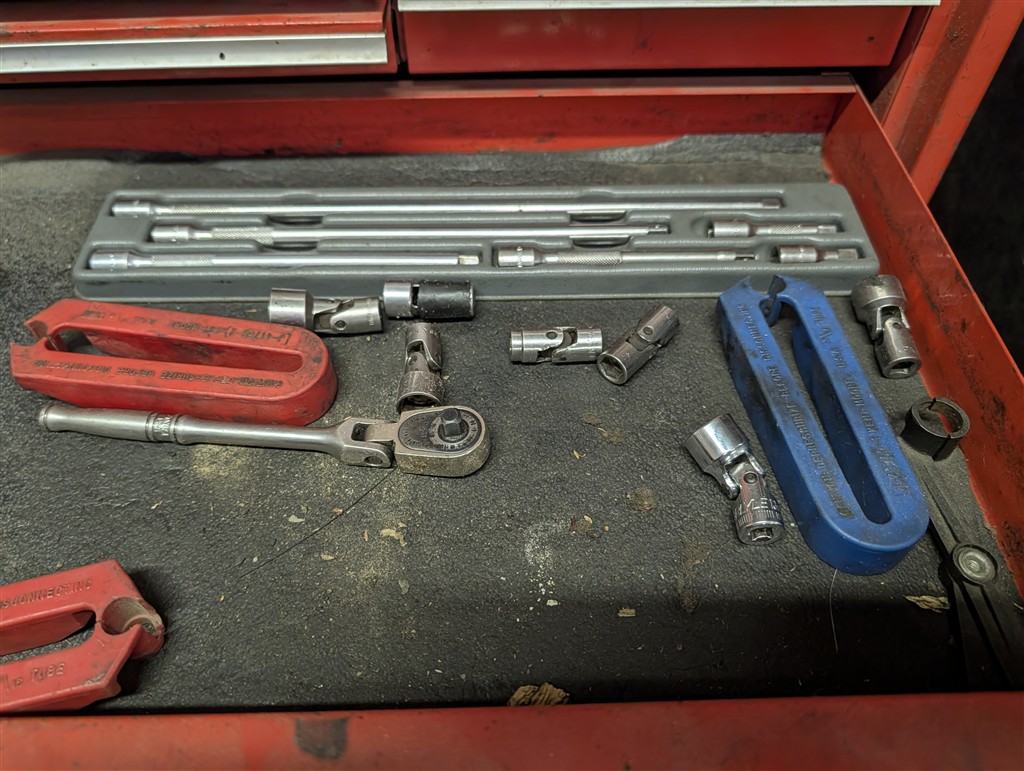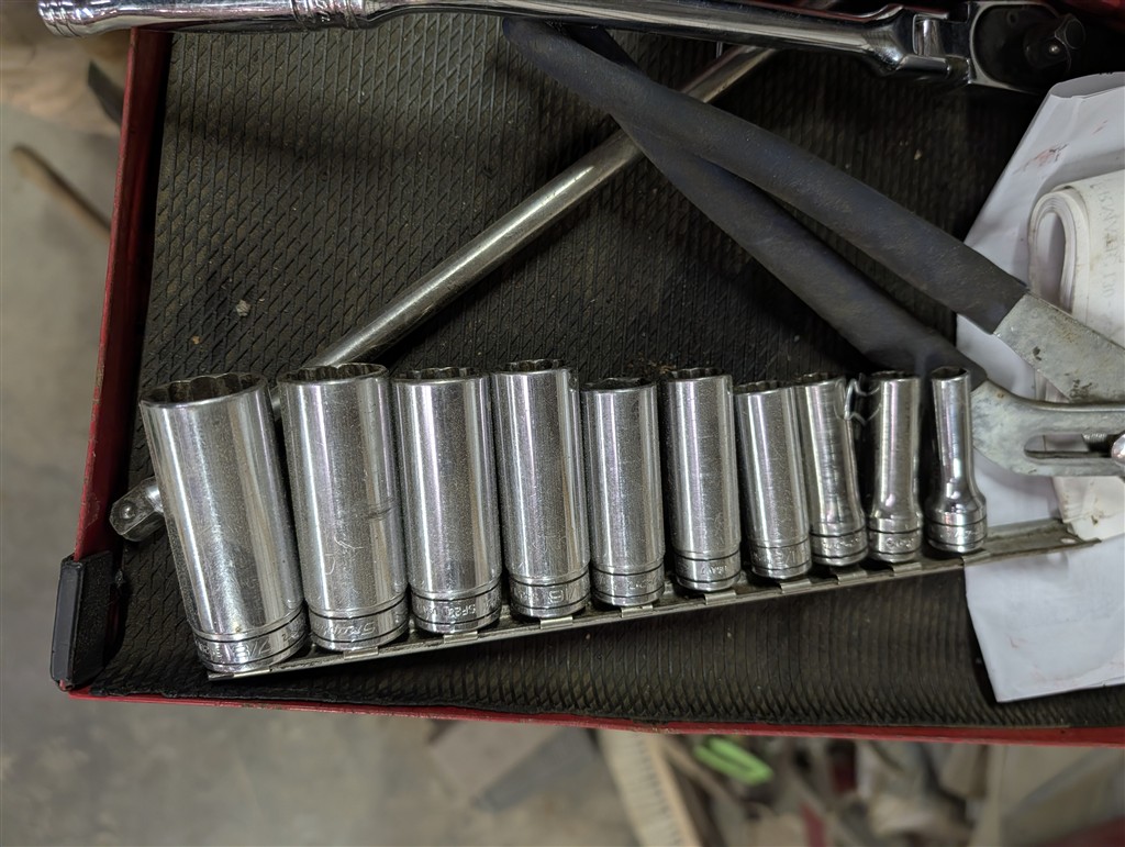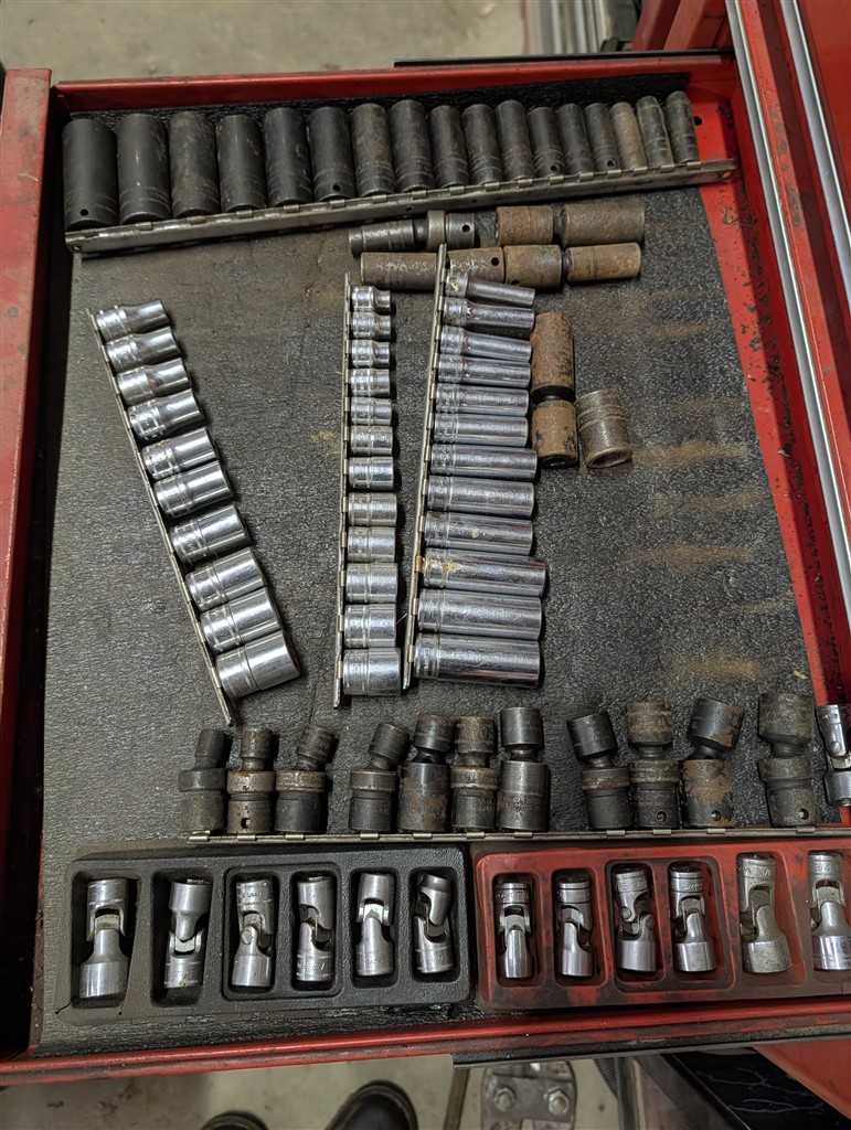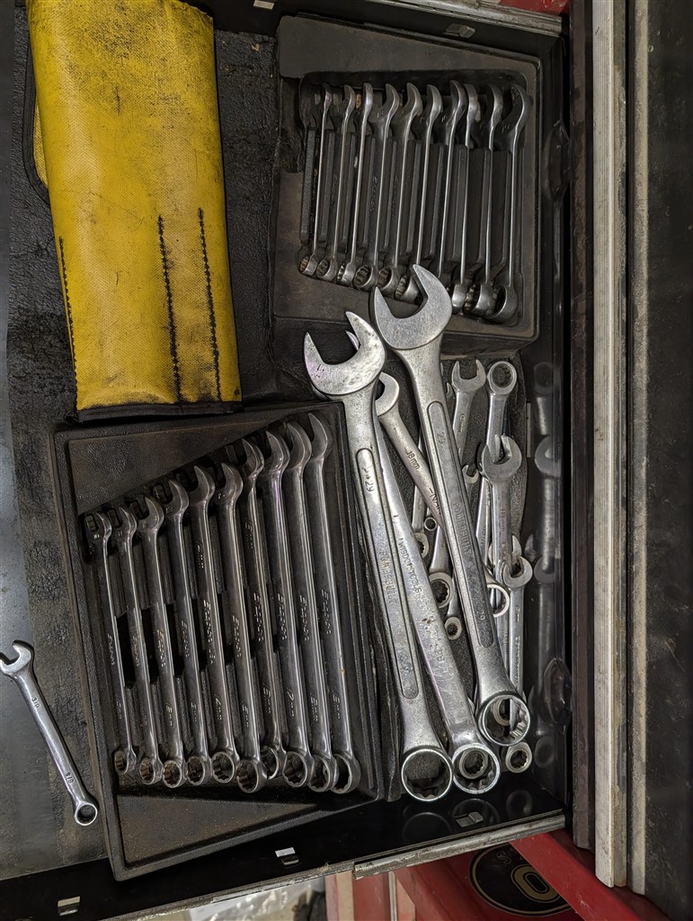 Snap-On 7-Drawer Rolling Cart; Snap-On Road Box; Snap-On 3-Drawer Tool Caddy; Snap-On Pry Bar; Snap-On 3/8” Drive Flex Head Bent Shaft Ratchet; Pry Bars; Snap-On 1/4″ Drive Ratchet/Socket Set In Cases; Snap-On Weather Head Fitting Socket Set; Snap-On 3/8” Drive Ratchet; Snap-On Shallow Sockets 3/8”; Snap-On 3/8” SAE Set; Snap-On 1/2″ Drive Metric Sockets; Snap-On 1/2″ Drive Deep Well Sockets; Craftsman Ratcheting SAE & Metric Wrench Set; Snap-On 1/2″ Drive SAE Sockets; Snap-On 1/2” Drive Ratchet; Snap-On 1/2” Extensions; Snap-On 1/2” Flex Head Socket; Snap-On Deep Well 1/2” Drive Sockets; (2) Snap-On Heavy Torque Wrenches; Snap-On Visual Inspection Camera; Snap-On Digital Start/Charging Tester; Snap-On Analog Start/Charge Tester; Snap-On Counselor II; Snap-On Puller Set; Snap-On Ring Plier Set; Snap-On Creeper; Snap-On 1/2” Drive Metric Sockets; Snap-On 1/2” Drive Deep Well Socket; Snap-On Deep Well 3/4” Drive Sockets; Snap-On Digital Torque Wrench