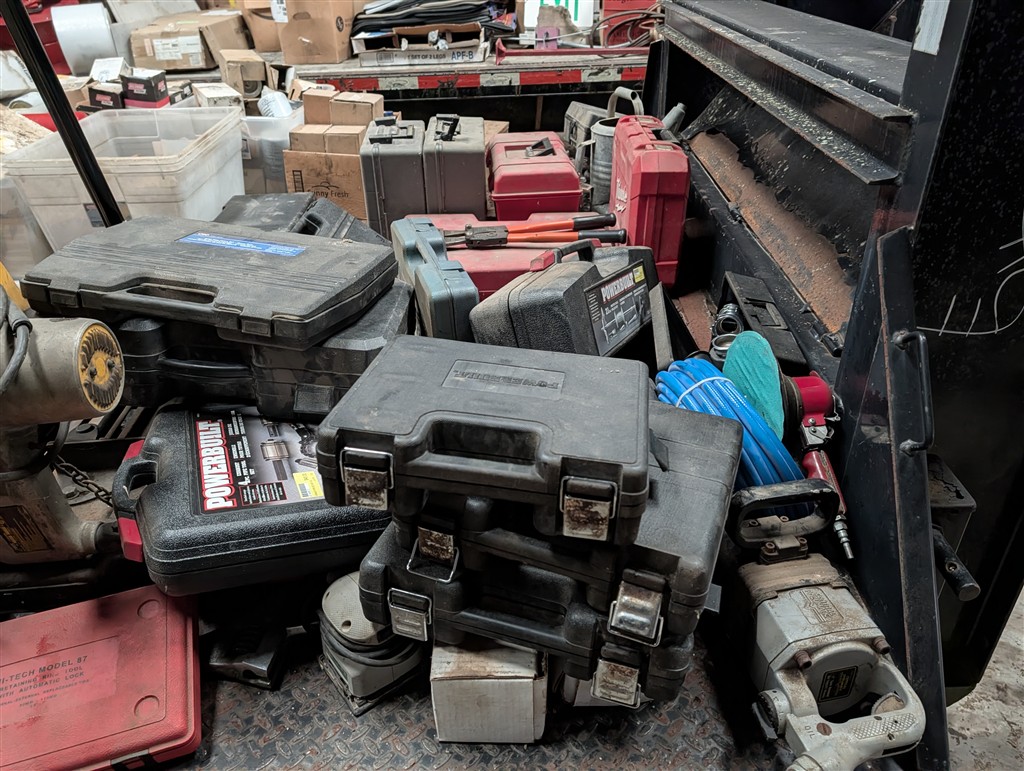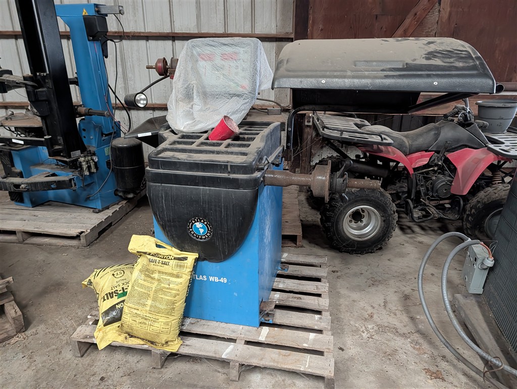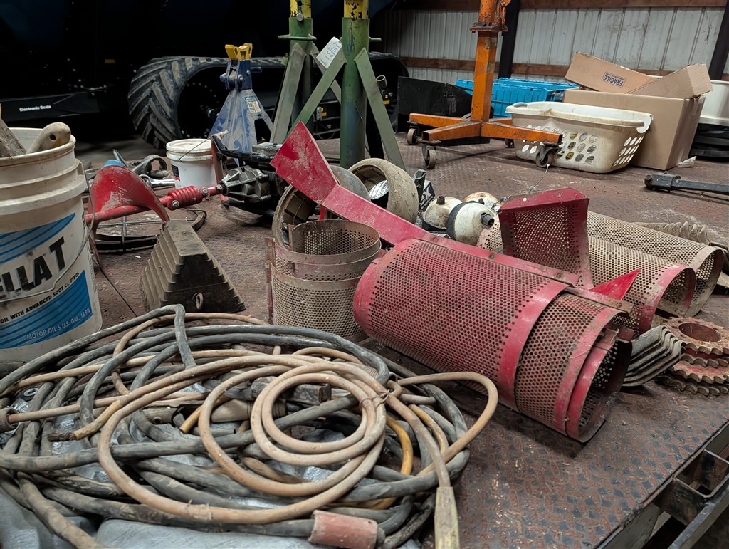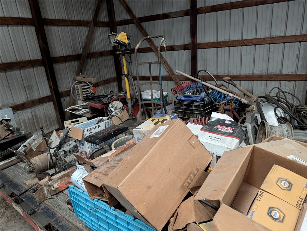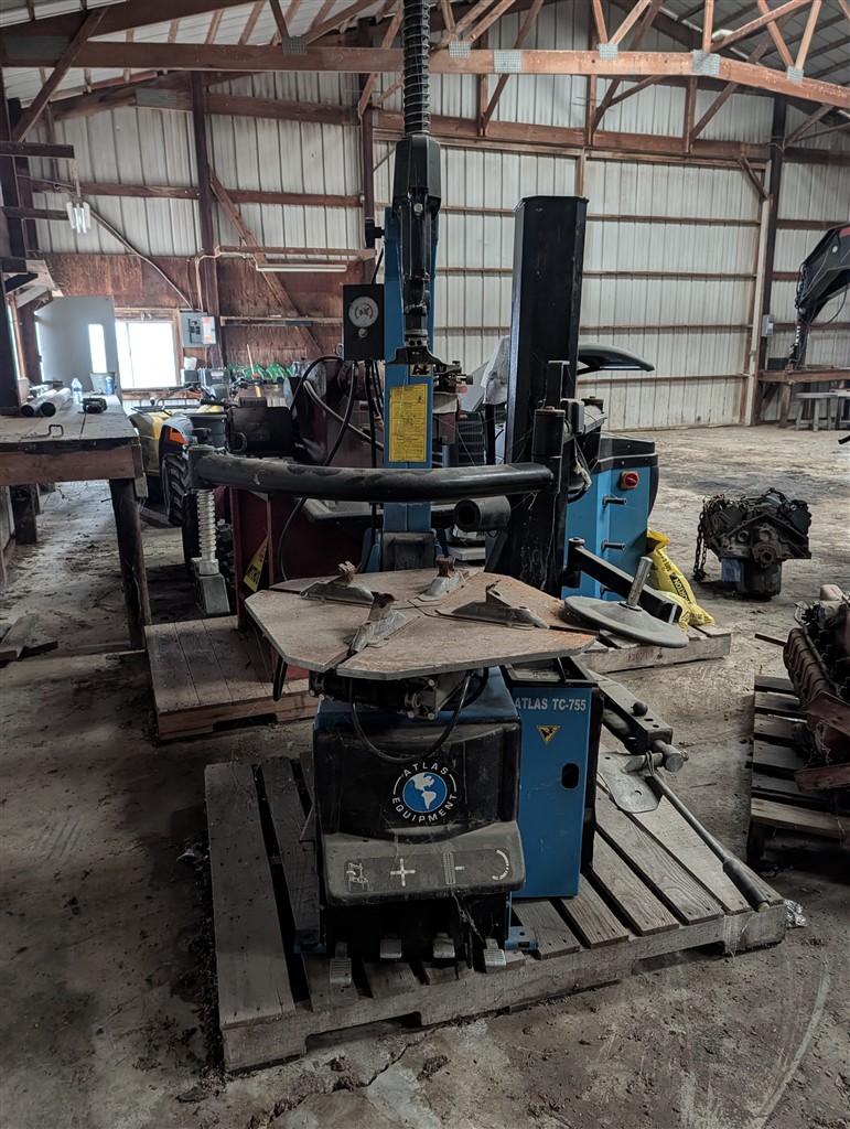 Commercial Pallet Racking; Steel Shelving; Atlas Wheel Balancer; Modern Atlas Tire Changer TC755; Transmission Jack; Planter Parts; Kinze Seed Tubes; Jack Stands; Hammer Wrenches; Earthquake Post Hole Digger; Large Clevis; Hydraulic Jacks; Air Tools; 1” Central Punches Air Impact; Hi Tech Rotary Set; OTC Bearing Remover; 3/4” Drive Impact Socket Set; Large Adjustable Wrench; 1” Impact Socket Set; SAE & Metric 3/4” Impacts; Oil Filters; Air Filters; Powerbilt Exhaust Tool; Jumper Cables; Organizers; Body Hammer Set; Axle Puller Set; Lincoln Heavy Duty Hose Reel; Flaring Tool Set; Creepers; Welding Cable Leads; Black & Decker Angle Drill; Acetylene Torch Set; Rolling Tool Caddy; Chains; Boomers; Tie Downs; Electrical Cords; Metal Tool Cabinets; A Frame Shop Hoist W/Trolly; Large Bench Vise; Miller Mig Welder 252; Protemp Shop Heater; Lincoln Ranger 8 Stick Welder; Engine Jacks; Loadstar Electric Hoist; 3T Chain Hoist; 4T Chain Hoist; Tractor Splitting Stand; Air Floor Jack; 10T Floor Jack; Tool Caddy’s; Hydraulic Presses; Parts Washer; Rolling Shop Stairs; Pallet Jack; Cherry Picker; Warehouse Carts; Battery Tester; Mac Tool Cabinet; Craftsman Intermediary Box; Craftsman Rolling Tool Box; Craftsman Ratcheting SAE & Metric Wrench Set; Welding Clamps; Metric & SAE Deep Well Socket; NPT Flex Head Metric Socket Set; Pipe Wrenches; 3/4” Drive Ratchets; Line Wrenches; A/C Gauges; Hammers; Pliers; Screw Drivers; Snap Ring Pliers; Gear Wrench Service Kit; Large SAE & Metric Wrenches; Blue Point Ball Peen Hammers; SAE & Metric Allen Key Sets; SAE & Metric Craftsman Sockets; Large Adjustable Wrench; Tap & Die Sets; Carbide Burrs; Brake Line Flaring Tools; Blue Point Injector Tester Set; 1/2” Ratchet Set; SAE & Metric Stubby Wrench Set; Blue Point SAE Wrench Set; Clutch Hub Puller Kit; Compression Tester Set; Sledge Hammer; Ingersol Rand 24 Cfm 175 Psi 8 Gal Compressor; Lincoln Ideal Arc Tig 300/300 Welder; Work Benches; 3/4″ Breaker Bar; Proto Extractor Set; Metal Band Saw; Drill Bits; Posi Lock Pullers; Frontier Tool Box; Hand Dollies; Pallet Jacks