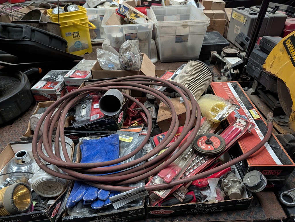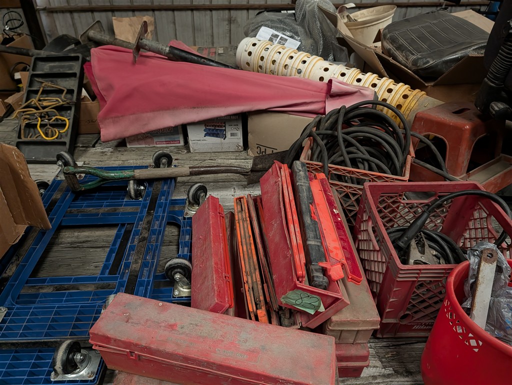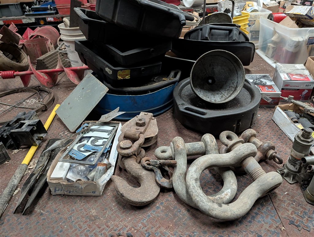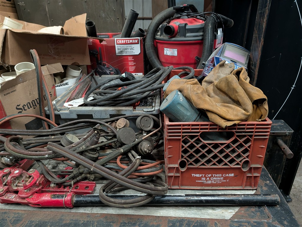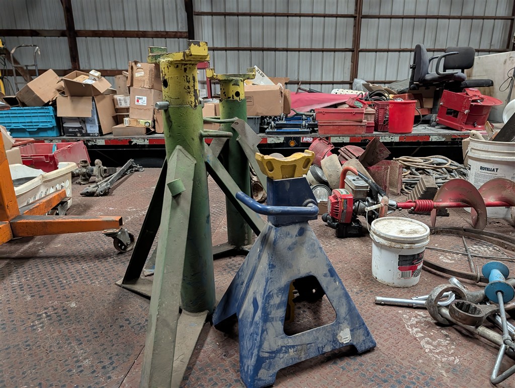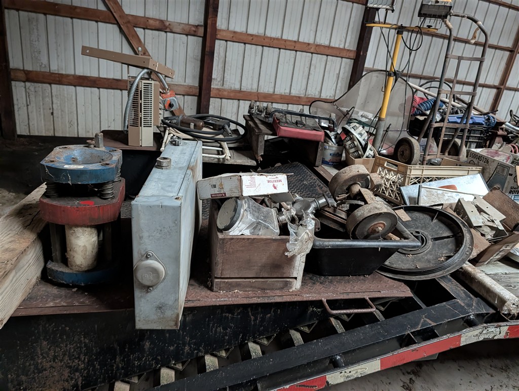 Commercial Pallet Racking; Steel Shelving; Atlas Wheel Balancer; Modern Atlas Tire Changer TC755; Transmission Jack; Planter Parts; Kinze Seed Tubes; Jack Stands; Hammer Wrenches; Earthquake Post Hole Digger; Large Clevis; Hydraulic Jacks; Air Tools; 1” Central Punches Air Impact; Hi Tech Rotary Set; OTC Bearing Remover; 3/4” Drive Impact Socket Set; Large Adjustable Wrench; 1” Impact Socket Set; SAE & Metric 3/4” Impacts; Oil Filters; Air Filters; Powerbilt Exhaust Tool; Jumper Cables; Organizers; Body Hammer Set; Axle Puller Set; Lincoln Heavy Duty Hose Reel; Flaring Tool Set; Creepers; Welding Cable Leads; Black & Decker Angle Drill; Acetylene Torch Set; Rolling Tool Caddy; Chains; Boomers; Tie Downs; Electrical Cords; Metal Tool Cabinets; A Frame Shop Hoist W/Trolly; Large Bench Vise; Miller Mig Welder 252; Protemp Shop Heater; Lincoln Ranger 8 Stick Welder; Engine Jacks; Loadstar Electric Hoist; 3T Chain Hoist; 4T Chain Hoist; Tractor Splitting Stand; Air Floor Jack; 10T Floor Jack; Tool Caddy’s; Hydraulic Presses; Parts Washer; Rolling Shop Stairs; Pallet Jack; Cherry Picker; Warehouse Carts; Battery Tester; Mac Tool Cabinet; Craftsman Intermediary Box; Craftsman Rolling Tool Box; Craftsman Ratcheting SAE & Metric Wrench Set; Welding Clamps; Metric & SAE Deep Well Socket; NPT Flex Head Metric Socket Set; Pipe Wrenches; 3/4” Drive Ratchets; Line Wrenches; A/C Gauges; Hammers; Pliers; Screw Drivers; Snap Ring Pliers; Gear Wrench Service Kit; Large SAE & Metric Wrenches; Blue Point Ball Peen Hammers; SAE & Metric Allen Key Sets; SAE & Metric Craftsman Sockets; Large Adjustable Wrench; Tap & Die Sets; Carbide Burrs; Brake Line Flaring Tools; Blue Point Injector Tester Set; 1/2” Ratchet Set; SAE & Metric Stubby Wrench Set; Blue Point SAE Wrench Set; Clutch Hub Puller Kit; Compression Tester Set; Sledge Hammer; Ingersol Rand 24 Cfm 175 Psi 8 Gal Compressor; Lincoln Ideal Arc Tig 300/300 Welder; Work Benches; 3/4″ Breaker Bar; Proto Extractor Set; Metal Band Saw; Drill Bits; Posi Lock Pullers; Frontier Tool Box; Hand Dollies; Pallet Jacks