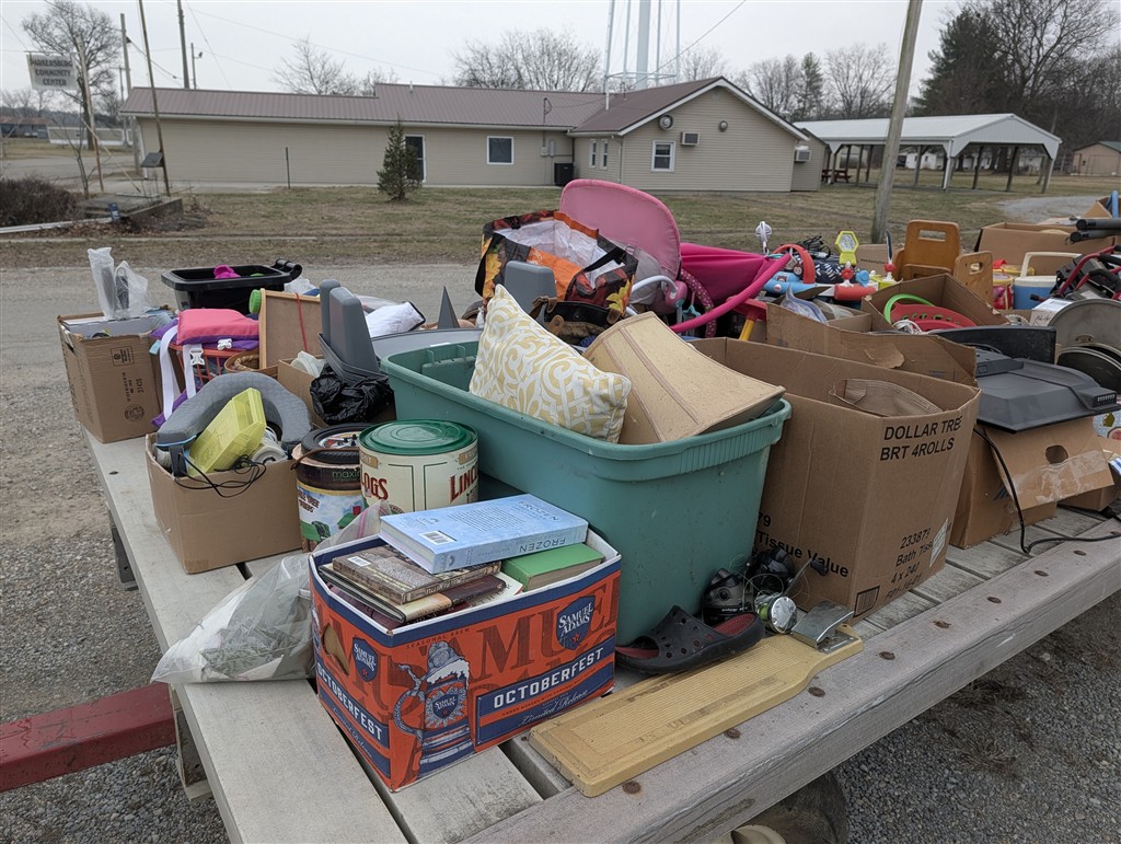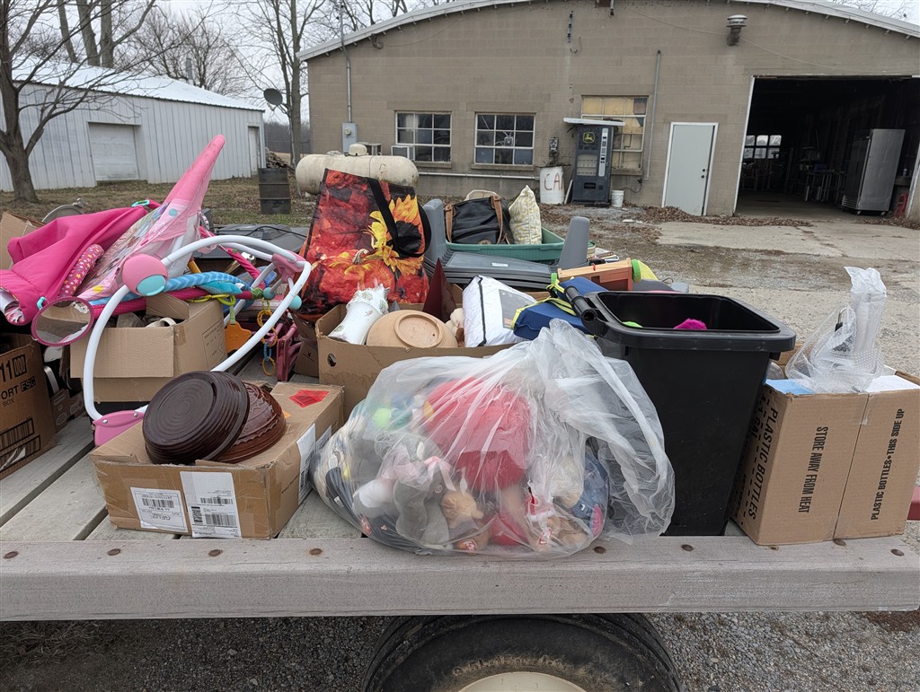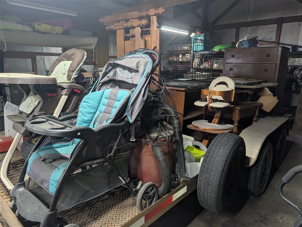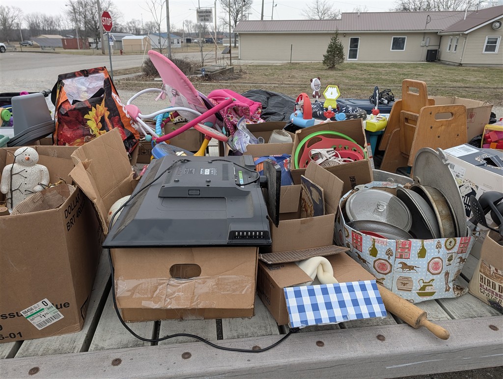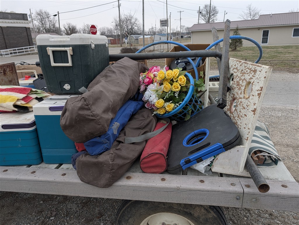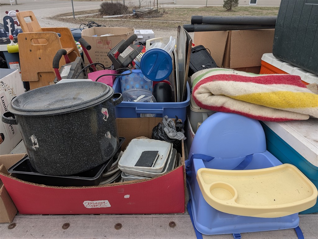 Kenmore 5×5 Refrigerator; Desk; Drop Leaf Table; 4 Drawer Filing Cabinet; Floor Buffer; Longaberger Baskets; Waterfall Wardrobe; Craftsman Bar Stool; Pepsi Drink Cooler; Gas Cans; Pet Crate; Maytag Wringer Washer; Children’s Toys; Kitchen Table and Chairs; Kitchen Hutch; Pyrex Stackable Bowl Set; Small Kitchen Appliances; Flatware; Dinner Ware; Plates