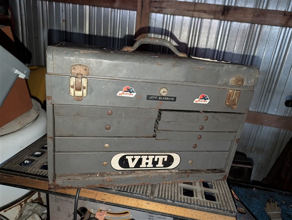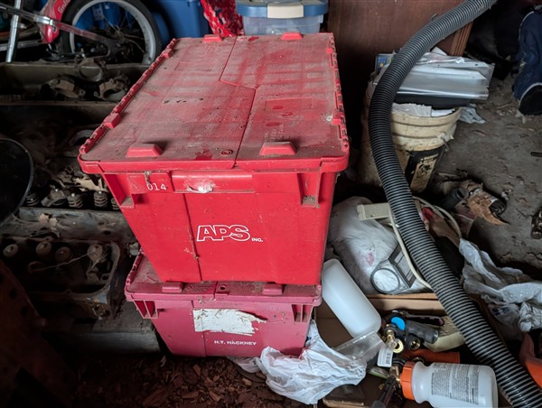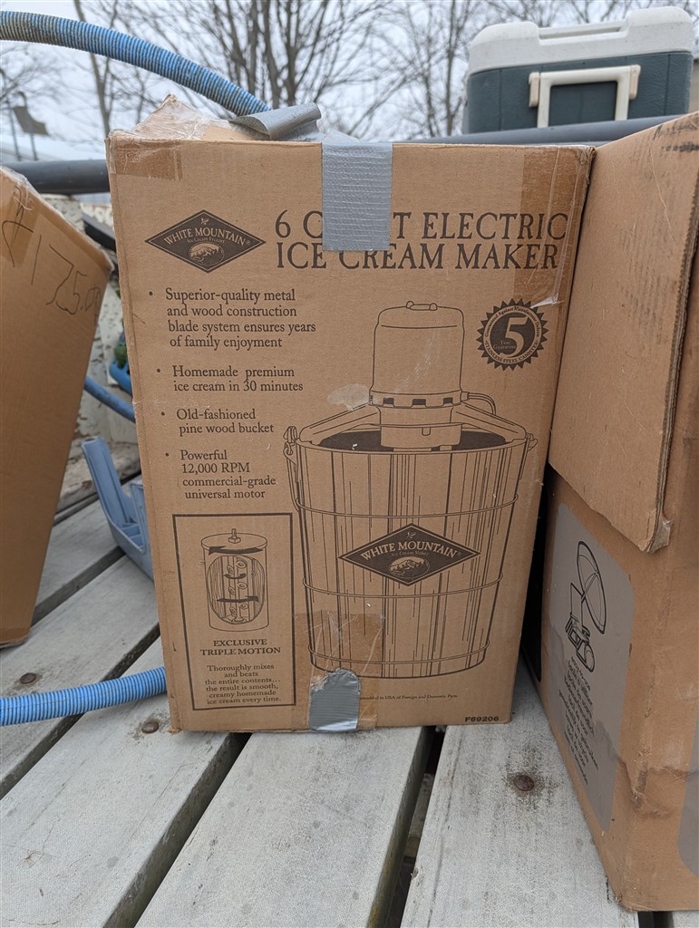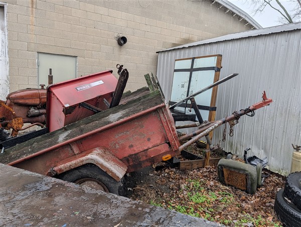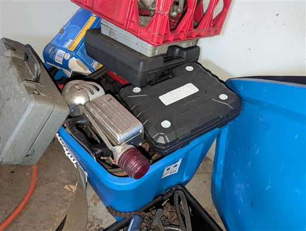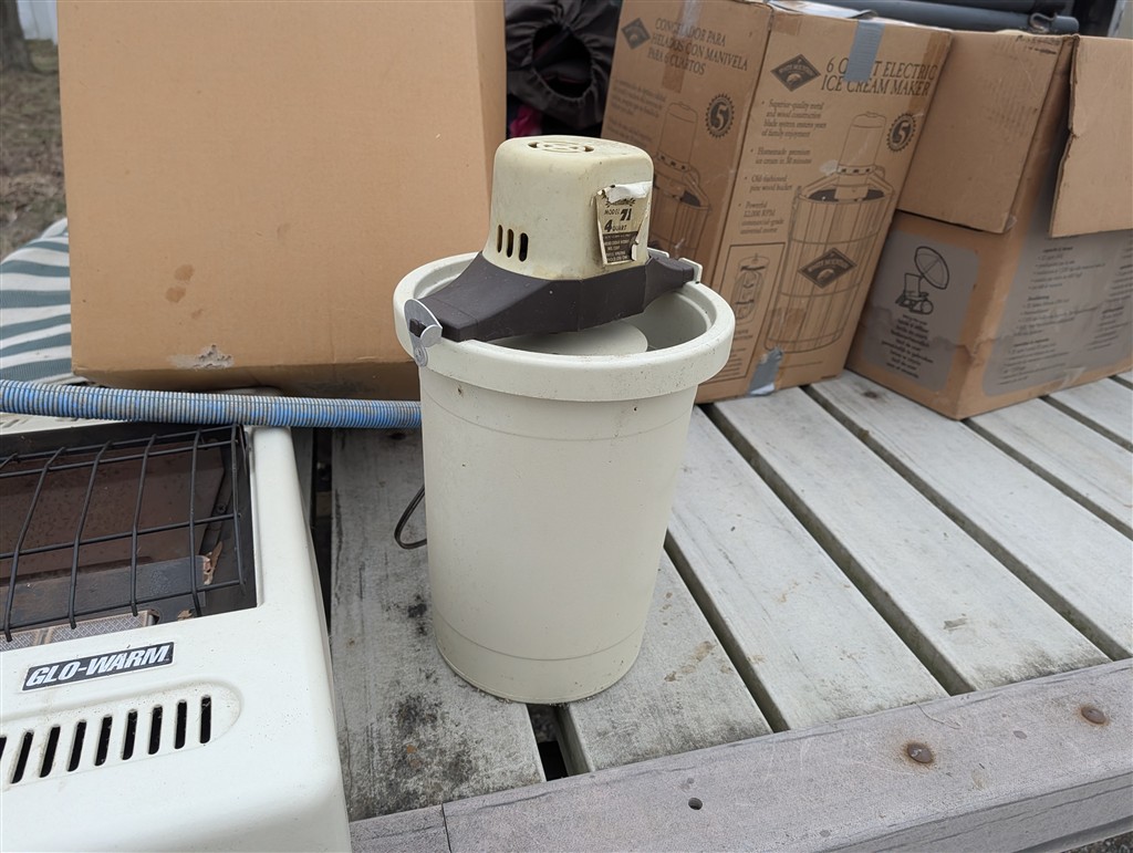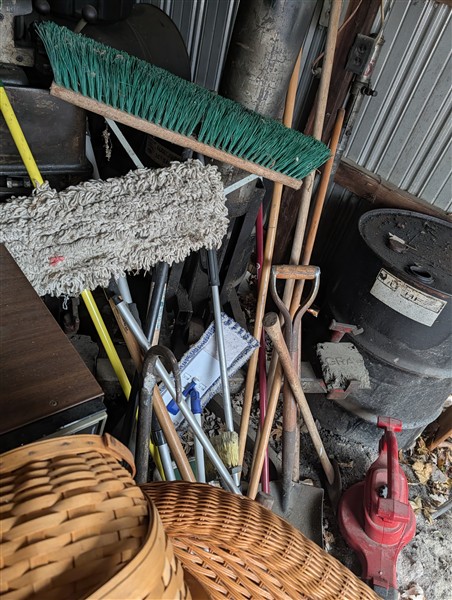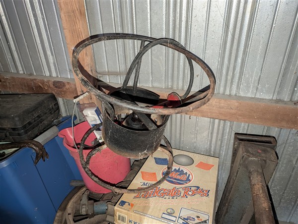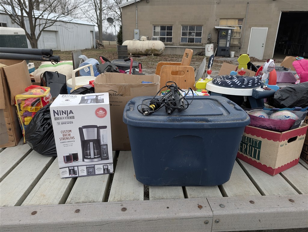 Kenmore 5×5 Refrigerator; Desk; Drop Leaf Table; 4 Drawer Filing Cabinet; Floor Buffer; Longaberger Baskets; Waterfall Wardrobe; Craftsman Bar Stool; Pepsi Drink Cooler; Gas Cans; Pet Crate; Maytag Wringer Washer; Children’s Toys; Kitchen Table and Chairs; Kitchen Hutch; Pyrex Stackable Bowl Set; Small Kitchen Appliances; Flatware; Dinner Ware; Plates
