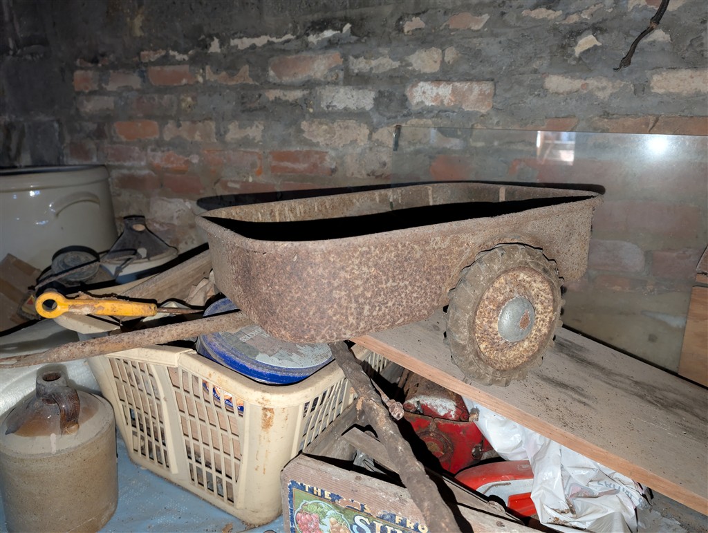 Oliver 880 Pedal Tractor; Oliver 880 Pedal Tractor Wagon; Farmall 806 Toy Tractor; 10 Gal Western Stoneware Crock; Crock Jars; 1 Gal Crocks; Cast Iron Peters Pump Co. Pitcher Pump; Wood Block & Tackles Pulley; 1 Gal Crock Jar; ; (2) All American Canners; Fulton Corn Sheller; Insulators; Froe; Vintage Metal Mailbox & Post; Milk Cans; Large Saw Blades; Galvanized Tub; Nail Keg; Horse Blinders; Horse Drawn Plow; Walmart Toy Truck; Nylint Toy Truck; Old Baritone Brass Horn; Metal Tractor Wheels; 2 Mans Saws; Black Hawk corn Sheller w/Box; Coal Bucket; (2) Wood Barrels; Enamel Wash Pan; Vulcan Horse Drawn Plow Evansville, IN; Blue Flame Gas Co. Thermometer; Blue Ball Jars; Coffee Grinder; Comic Books; Children’s Books; Globe; Little Touch & Sew; US Army air Force Bib Overalls; Auto Harp; Razer Strap; Military Hats; Thomas Edison Cylinder Phonograph; Military Service Uniforms; Army Fatigues; John Deere Chuck Wagon Toy; IH Tractor Toy; Crock Bowls; Railroad Lantern; Washboard; Lanterns; Radio Flyer Town & Country Wagon; Cider Press; Egg Baskets; Maytag Wringer Washing Machine; Old Metal Scales; Old School Desk; Cookbooks