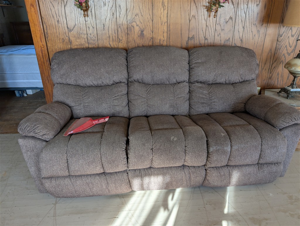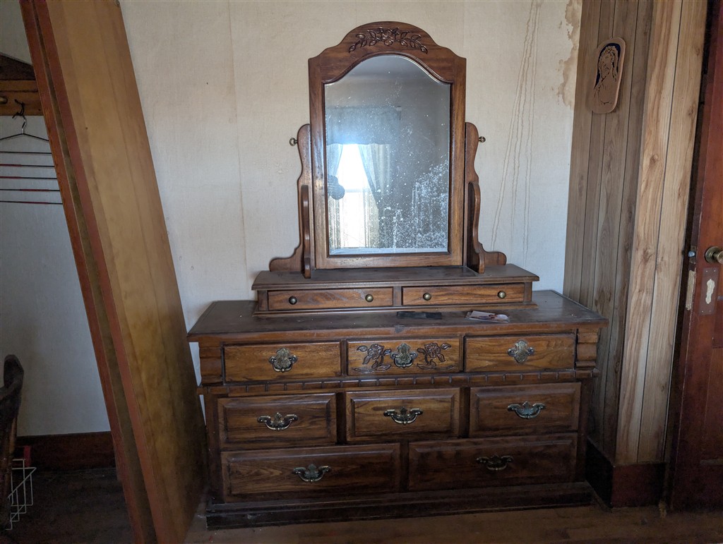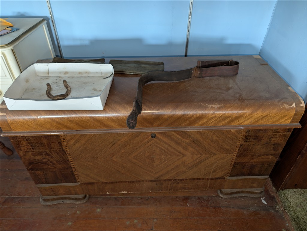 Lazy Box Electric Reeling Couch; Samsung TV; Salad Master Cookware; Kerosene Lamp; Full Size Bed Chest of Drawers Dresser & Mirror; Board Games; Bedroom Furniture; Oak Kitchen Table; Cedar Chest; Canning Jars – Gal. Pints-Quarts-Jelly; Large Oak Desk; Heavy Duty Floor Safe;; Christmas Decorations; Hay Trolley; Fence wire; Gas Cans; Wagner Paint Sprayer; Aluminum Wheels; Plastic Shelves; Push Brooms; Stainless Milking Can; 6000 BTU window AC in Box; Fence Posts; Fiberglass Truck Camper Shell off 92 Ford; Stainless Steel Sinks; Scrap Iron; (3) Saddles; (2) Saddle Stands; Toy Chest; Stereo; Ideal 2 Bay Dry Sink