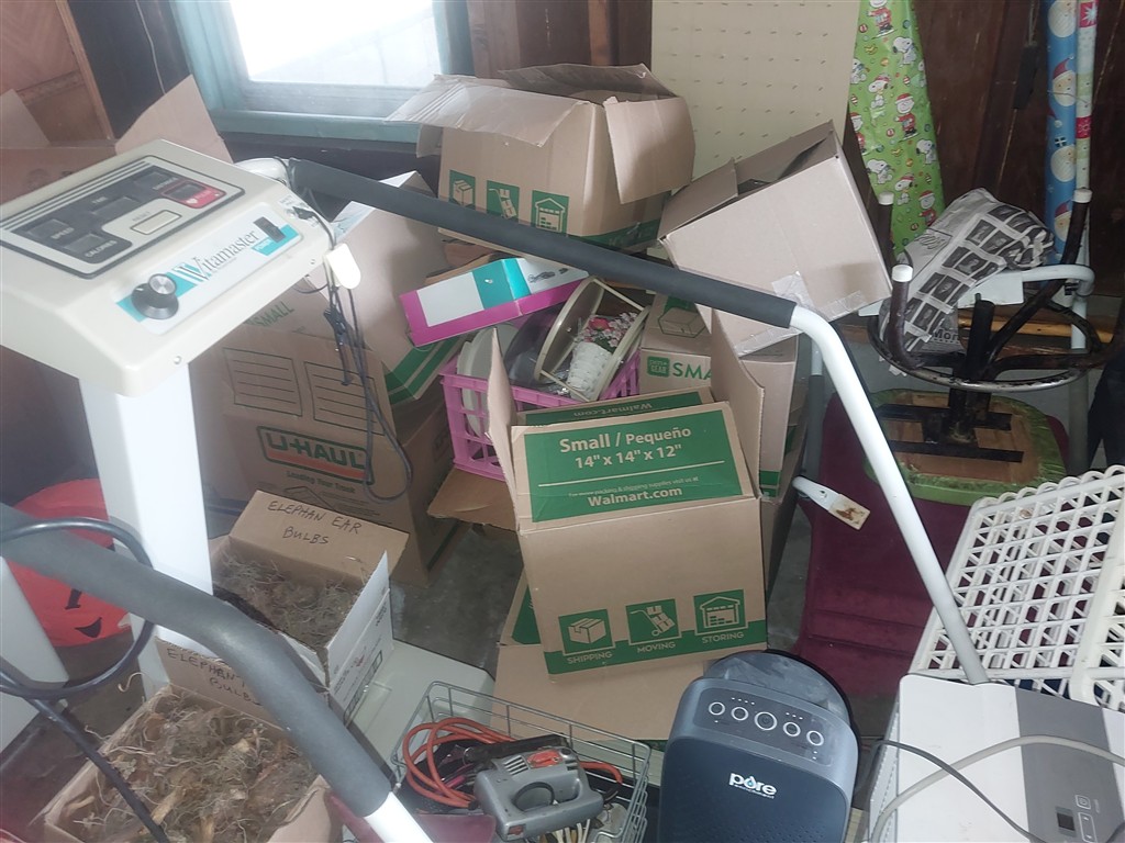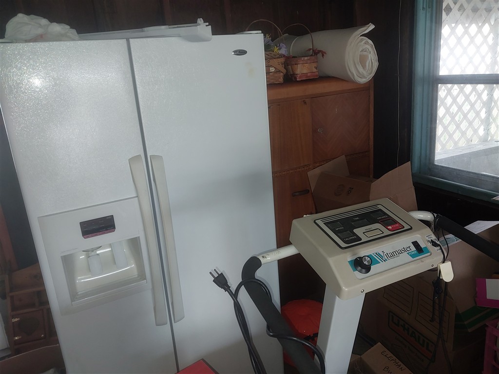 Stamp Collection; Christmas Items; Quilting Books; Jewelry Cabinet; Battery Charger; DVD Player; Travel Patches; Kitchen and Cookware; Treadmill; Whirlpool Washer; Kenmore Dryer; Amana Refrigerator; Frigidaire Gas Stove; Waterfall Gentleman’s Chest; Hope Chest; Window Air Conditioner Unit; 11 Gallon Coleman Air Compressor; Metal and Plastic Shelves; Toaster Oven; 2 Dehumidifiers; Porch Swing; Concrete Blocks; Elephant Ear Bulbs